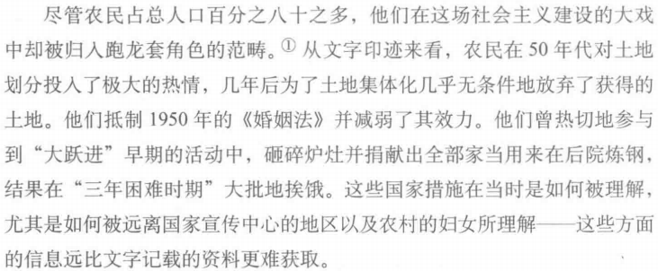 以上便是整本书的大致内容,再次感谢所有的小组成员对整本书内容的准确把控;由于本人的社会学和语言功底有限,这里尽可能引用来自北大马院博士冯嘉馨的《“地平面”下的历史》来解读。这篇作者似乎是美国的一个女权作家,她以农村女性的独特视角讲述了中国上世纪发展的部分历史(解放、集体化、大跃进等等)。